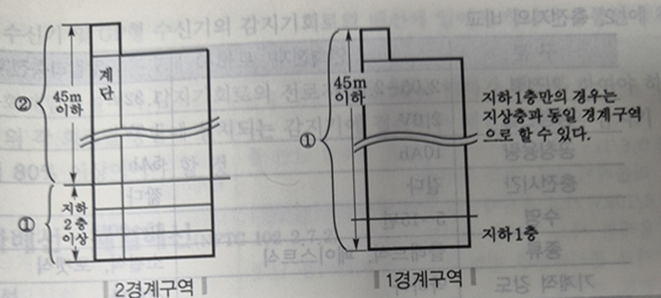 계단, 경사로(에스컬레이터 경사로 포함), 엘리베이터 승강로 (권상기실이 있는 경우 권상기실), 린넨슈트, 파이프피트 및 덕트, 기타 이와 유사한 부분에 대하여는 별도로 경계구역을 설정하되, 하나의 경계구역은 높이 45m 이하로 하고, 지하층의 계단 및 경사로(지하층의 층수가 1일 경우는 제외)는 별도로 하나의 경계구역으로 하여야 한다.